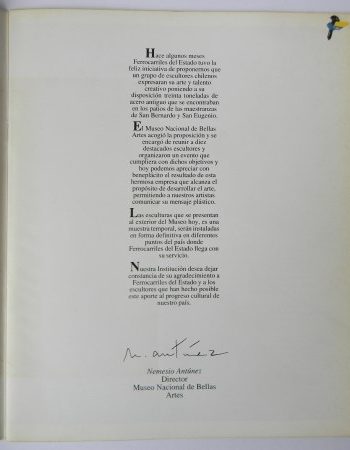 $45.000 Añadir al carritoSantiago; Fundación Andes, 1988. Primera edición. Firmado y dedicado por el artista. Texto de Waldemar Sommer y testimonio del artista. Carpeta desplegable con 8 reproducciones. Cuarto menor (24.5×21.5 cm). Páginas sin numerar. Estado de conservación: Muy buen estado.