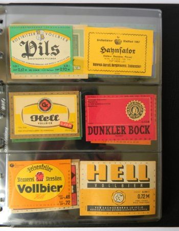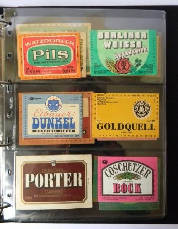 [DDR]; [Grobenhain; Dresden; Leipzig; Magdeburg; Karl-Marx-Stadt], [c.1950-90]. Extraordinaria colección de 196 etiquetas de cervezas de la ex-República Democrática Alemana (cierra la colección una bella etiqueta de cerveza japonesa). 35 etiquetas poseen timbres de anterior propietario, coleccionistas de etiquetas, algunos miembros de la International Beerlabel Collector: Matthias Kupral, Klaus Ehm, Heinz Masch, Ullrich Denkert, Klaus Finschow, Martina Kranebitter, Holger Beyer, et al., algunas poseen más de un timbre, es decir, pertenecieron a distintas colecciones. Las 197 etiquetas contenidas en carpeta de conservación. Estado de conservación: Excelente.