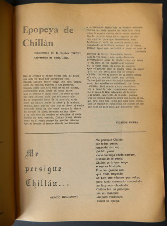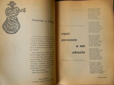 Chillán; Revista Editada por el Grupo Literario de Ñuble, 1977. Edición dedicada al aniversario de Chillán. Textos de Sergio Uribe Acuña; Nicanor Parra; Violeta Parra; Tomás Lago; Ernesto Vásquez Méndez; Tito Castillo; Roberto Meza Fuentes; Fernando González Urizar; Sergio Hernández, entre otros. Encuadernación rústica. Cuarto (26.5 x 18.5 cm). 24 páginas. Estado de conservación: Buen estado, cubiertas con leve desgaste.