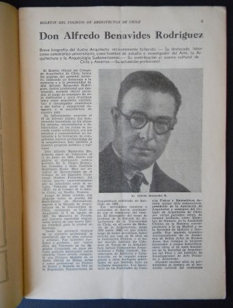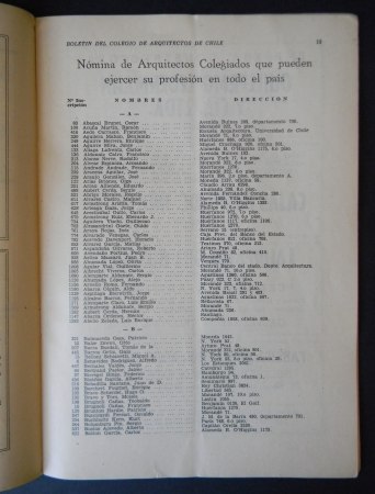 Santiago; Colegio de Arquitectos de Chile, Marzo de 1959. Cubierta: Torre de la Iglesia de San Pedro de Atacama, Fotografía de Antonio Quintana. Contiene: Nómina de Arquitectos Colegiados que pueden ejercer su profesión en todo el país; Transformación Local del Colegio de Arquitectos; Don Alfredo Benavides Rodríguez. Encuadernación rústica. Cuarto (27×19 cm). 32 páginas. Estado de conservación: Buen estado, timbre en cubierta y portada.