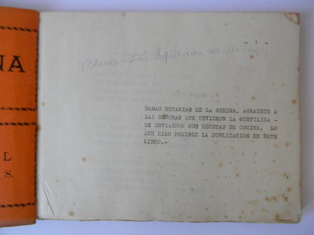 La Serena; Comité Damas Rotarias/Rotary Internacional, 1968. Primera edición. Recetas de Edith de Hucke, Tala de Rehier, Ana de Fischer, Helga de Pena, Cora de Bitran, entre otras. Encuadernación rústica. 16.5×22 cm. 100 páginas. estado de conservación: Buen estado, cubierta con leve desgaste; nombre de anterior propietaria en cubierta y portada.