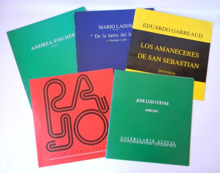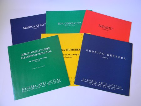 Santiago; Galería Arte Actual, 1989-94. Directoras: María Elena Comandari, María Luisa Geisse, María Eugenia Ossa, Patricia Ready. Pictográfica «Santiago», Enrique Zamudio; El Territorio Plástico de Rayo, Omar Rayo; Paisajes-Ciudades, Álvaro Bindis; Ignis/Aer/Terra/Acqua: Obras Recientes, Paulina Humeres; Esculturas, Edgar Negret; (Pintura), Patricia Ossa; De la Tierra del Fuego (Pinturas), Mario Lagos; (Pintura), Mónica Arroyo; (Tapices), Andrea Fischer; Pinturas, Rodrigo Herrera; «En Busca del Tiempo Perdido» Pinturas, Hernán Meschi; …De Atrás Pica el Indio, Pinturas, Jorge González Lohse, Alejandro Quiroga Vial; Pinturas, Raúl Lara; «Pinturas de la Tierra» Ida González; «En Jehová Confío», Pinturas, Soledad Alsina; Los Amaneceres de San Sebastián, Pinturas, Eduardo Garreaud; Dibujos, José Luis Cuevas. Encuadernación rústica. 22×21 cm. 4-6 pp., con ilustraciones. Estado de conservación: Muy buen estado.