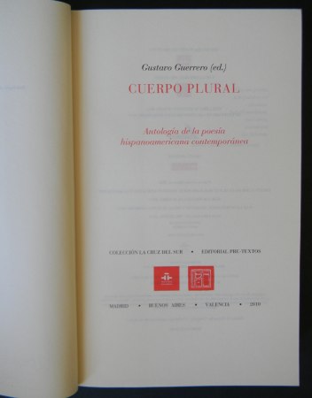 Madrid; Editorial Pre-Textos, Colección Cruz del Sur, 2010. Prólogo de Gustavo Guerrero. Contiene poemas de Nadia Prado, Damaris Calderón, Sergio Parra, Germán Carrasco, Malú Urriola, Yanko González, entre muchos otros. Encuadernación rústica. Octavo mayor (22 x 14 cm). 616 páginas + DVD. Estado de conservación: Buen estado, cubiertas con leve desgaste; firma de anterior propietario en página de cortesía.