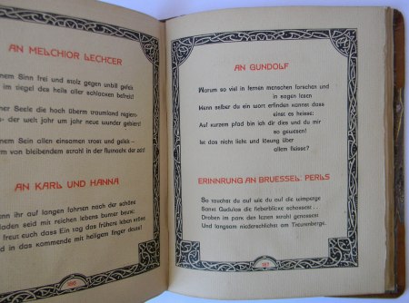 Berlín; Blaetter für Die Kunst, 1907. Primera edición. Con diseños del gran artista y diseñador Melchior Lechter. Encuadernación holandesa con punteras y guardas con papel marmolado. Cuarto menor (23.5×19.5 cm). 213 páginas, con bellas ilustraciones y viñetas. Estado de conservación: Excelente, no conserva cubiertas originales.