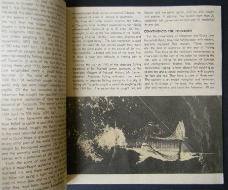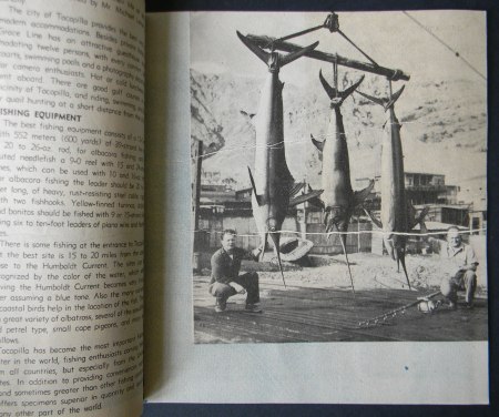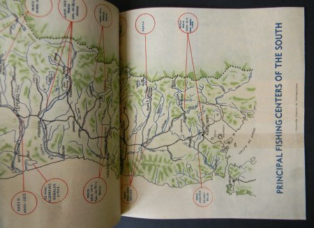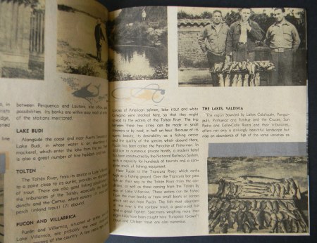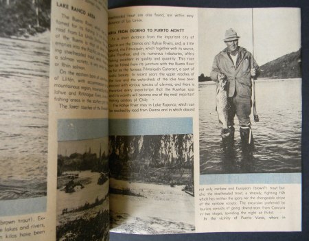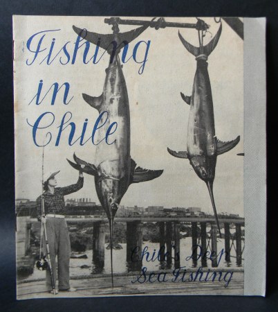 Santiago; Empresa Editora Zig-Zag, no indica año [c. 1940]. Folleto propagandístico en inglés, profusamente ilustrado con reproducciones fotográficas en b/n y un mapa en color de los principales centros de pesca desde Temuco a Puerto Montt. Rústica. 21 x 18.5 cm. 16 páginas. Estado de conservación: Excelente.