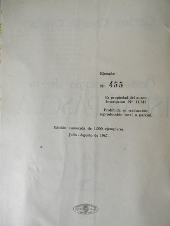 Santiago; Instituto Geográfico Militar, 1947. Edición numerada de mil ejemplares. Encuadernación rústica. Cuarto menor (23 x 17 cm). 207 páginas, contiene mapa desplegable. Estado de conservación: Buen estado, algunas páginas con leve marca de humedad en extremo inferior, sin afectar el texto; cubiertas con leve desgaste.