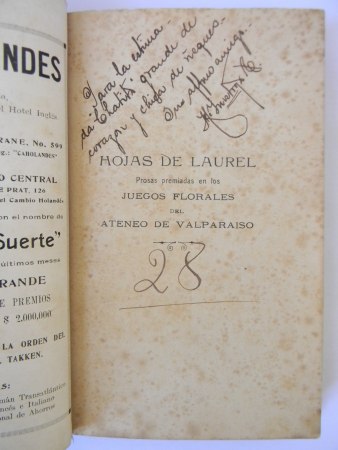 Valparaíso; Casa Editorial Arte-Fortuna-Luz, 1923. Primera Edición. Encuadernación Holandesa (medio cuero). Octavo Mayor (20×13 cm). 175 páginas, con ilustraciones. Estado de conservación: Muy buen estado, dedicatoria en portadilla.