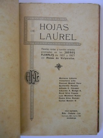 Hojas de Laurel: Prosas premiadas en los Juegos Florales del Ateneo de Valparaíso; Novelas cortas y Cuentos premiados en los Juegos Florales de 1922 y 1923 del Ateneo de Valparaíso | Mariano Latorre; Pascual Brandi; Carlos Bowen; Eduardo Budge, et al.