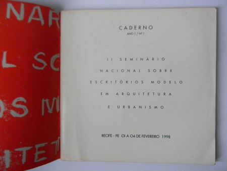 Recife; II Seminário Nacional Sobre Escritórios Modelo em Arquitetura e Urbanismo, 01 a 04 de Fevereiro, 1998. Caderno 1. Ano 1 / N. 1. Encuadernación rústica. Octavo mayor apaisado (20×20 cm). Sin paginar, ilustrado. Estado de conservación: Buen estado, tapas con algún desgaste leve.