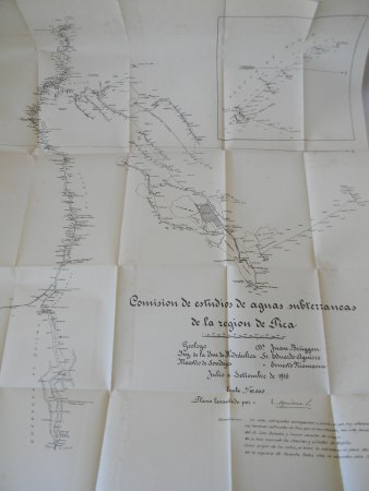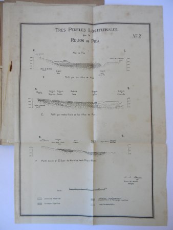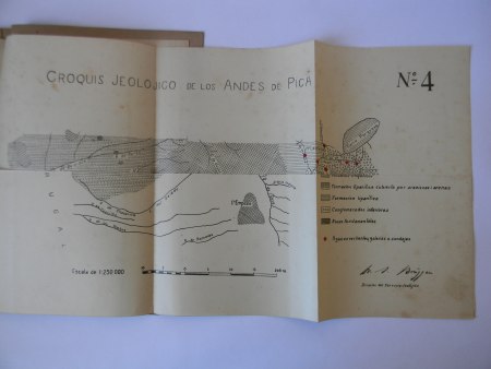 Santiago; Soc. Imp. y Lit. Universo, 1918. Publicaciones del Servicio Jeolójico, Folleto núm. 3. Primera edición. Encuadernación rústica. Cuarto (26×18.5 cm). 70 páginas, contiene los siguientes planos desplegables: Tres Perfiles Lonjitudinales Rejión de Pica; Perfil por el gran cono de rodados de la Quebrada de Quisma/Perfil por la Quebrada de Chintaguay; Croquis Jeolojico de Los Andes de Pica y Gran Plano Levantado por la Comisión de estudios de Aguas Subterráneas de la región de Pica [70×63 cm.]. Estado de conservación: Buen estado, no conserva una de sus láminas.