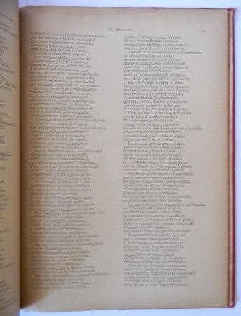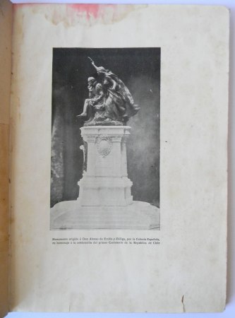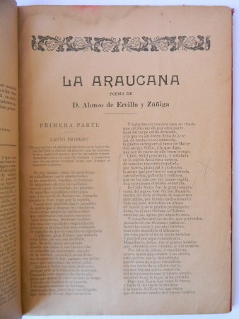 Santiago; Imprenta, Litografía y Encuadernación Barcelona, 1910. Edición especial dedicada a la juventud de Chile en el Centenario de su Independencia Nacional, precedida de una reseña histórica sobre el monumento al Trovador Soldado erigido, publicada por la Colonia Española, bajo la dirección del Delegado y Vocal del «Comité Ercilla». Encuadernación de tapas duras. Cuarto (26 x 19 cm). xv + 168 páginas, textos en doble columna. Estado de conservación: Buen estado en general, portada con reparación, mancha y firma de anterior propietario; 2 páginas reparadas; marca de humedad marginal en primeras páginas.