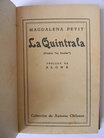 Santiago; Emp. Zig-Zag, Colección de Autores Chilenos, 1932. Cuarta edición. Prólogo de Alone. Retrato fotográfico de la autora en frontispicio. Encuadernación de tapas duras. Octavo (19.5×13.5 cm). 159 páginas. Estado de conservación: Buen estado, ejemplar reencuadernado conservando cubiertas originales; cubiertas con firma y mancha.