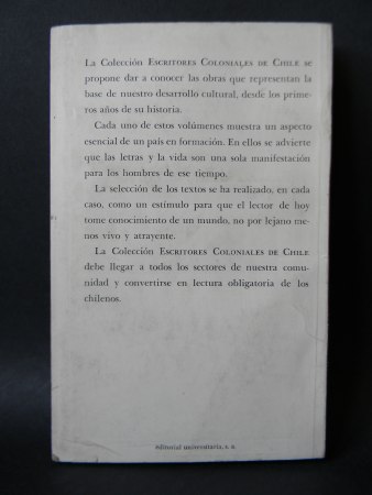 Santiago; Editorial Universitaria, Colección Escritores Coloniales de Chile, 1969. Selección, prefacio y notas de Mario Góngora. Encuadernación rústica. Octavo (18.5×11.5 cm). 167 páginas. Estado de conservación: Muy buen estado.