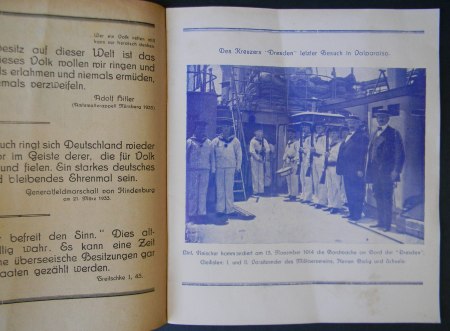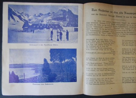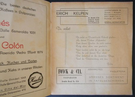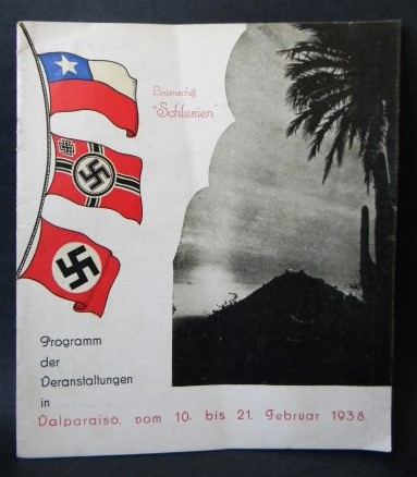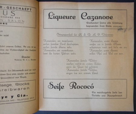 Valparaíso; Imp. Mercantil, 1938. Textos en alemán. El acorazado y buque escuela alemán «Schlesien» visitó Valparaíso en 1938, como parte de un viaje de instrucción por puertos chilenos, que incluyó también Punta Arenas y Valdivia. Encuadernación rústica. Octavo mayor (21.5 x 18.5 cm). 20 páginas, posee numerosa publicidad de casas comerciales alemanas de la época. Estado de conservación: Muy buen estado.