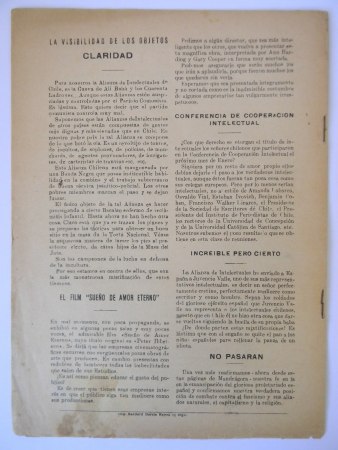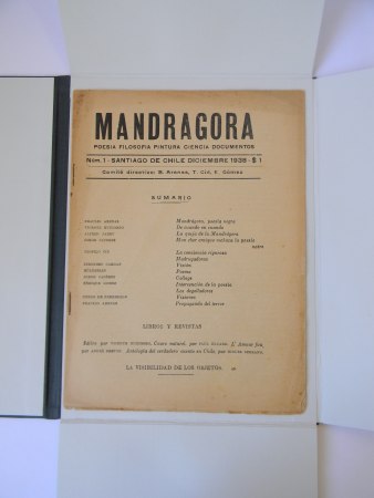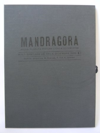 Santiago de Chile; Diciembre 1938. Primer número de una de las revistas surrealistas más importantes a nivel latinoamericano. Contiene textos de Braulio Arenas, Vicente Huidobro, Alfred Jarry, Jorge Cáceres, Teófilo Cid, Jerónimo Cardan, Hölderlin, Enrique Gómez. Rústica, corcheteada; contenida en carpeta de conservación ornamentada con serigrafías. Cuarto (27×20 cm). Páginas sin numerar [16] pp. Estado de conservación: Excelente.