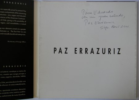 Santiago; Ministerio de Relaciones Exteriores, 1996. Primera edición. Ejemplar firmado y dedicado por Paz Errázuriz. Texto de Justo Pastor Mellado. Encuadernación rústica. Cuarto apaisado (24.5×24.5 cm). 18 páginas plegables, contiene fotografías en b/n. Estado de conservación: Muy buen estado, leve rozadura en portada.