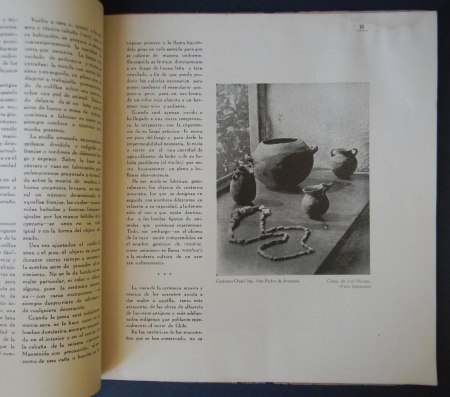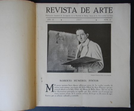 Santiago; Publicación Bimestral de Divulgación de la Facultad de Bellas Artes de la Universidad de Chile, 1937. Año III. Contiene: Roberto Humeres, Pintor, por Héctor Banderas Cañas; Las Cerámicas de los Aborígenes de Chile, por Dr. José Mazzini, entre otros artículos. Encuadernación rústica. Cuarto apaisado (27×25 cm). 48 páginas, profusamente ilustrada. Estado de conservación: Buen estado en general, cubiertas con desgaste y algunas manchas; marca de humedad en extremo superior.