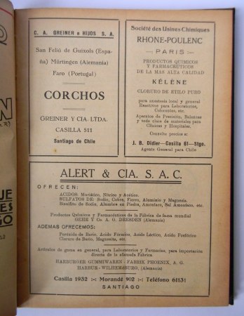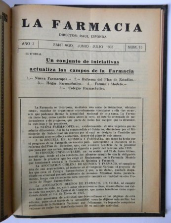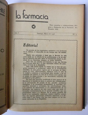 Santiago; Talleres Gráficos Smirnow/Imp. Vanguardia Farmacéutica, 1936-37. Números 4, 6, 7, 9, 10, 11, 12 y 15. Encuadernación de tapas duras. Cuarto (25.5 x 19 cm). Aprox. 30 páginas por número, profusamente ilustrada. Estado de conservación: Buen estado.
