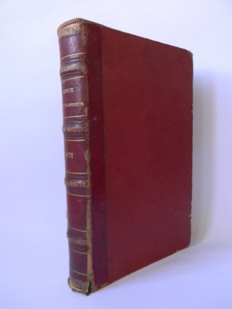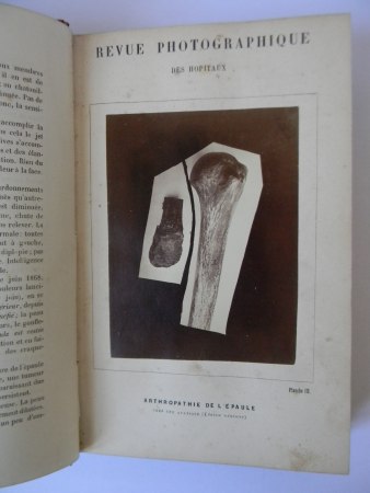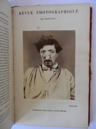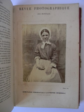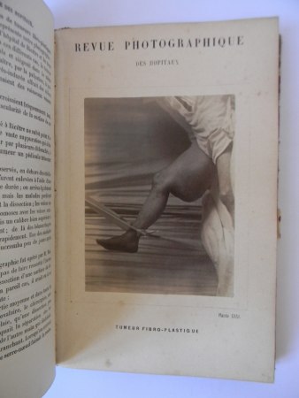 París; Adrien Delahaye, Libraire-Éditeur, 1871. Primera edición. Tercer año de la revista. Encuadernación holandesa. Cuarto menor (23×15 cm). 319 páginas+38 planchas fotográficas, principalmente de pacientes del hospital de París. La revista de fotografía del hospital de París se publica desde 1869 hasta 1876 y cuenta con la participación de Arthur De Montméja, jefe del servicio fotográfico del hospital San Luis. Estado de conservación: Buen estado, bordes y lomo con leve desgaste.
