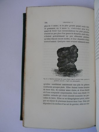 Paris; C. Reinwald, Libraire-Èditeur, 1882. Traduit de l´anglais: M. Levèque. Primera edición en francés de uno de los últimos trabajos de Darwin. Encuadernación en tela editorial verde con títulos en dorado. Cuarto menor (23.5×15 cm). xxviii- 264 páginas, con algunas ilustraciones intercaladas en el texto. Estado de conservación: Muy buen estado, posee timbre de dueño anterior.