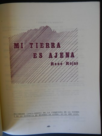 Coyhaique; Depto. de Cultura, Secretaría Ministerial de Educación XI Región, 1990. Fotografías: Humberto Ojeda, Víctor Panichine, Mario Miranda, Leonel Galindo, Peter Hartman. Textos de Gloria Arrigóni, Leonel Galindo, Roberto Álvarez, Renato Cárdenas, Enrique Valdés, René Rojas, entre otros. Encuadernación rústica. Cuarto (26.5×21.5 cm). 80 páginas, profusamente ilustrado. Estado de conservación: Muy buen estado.