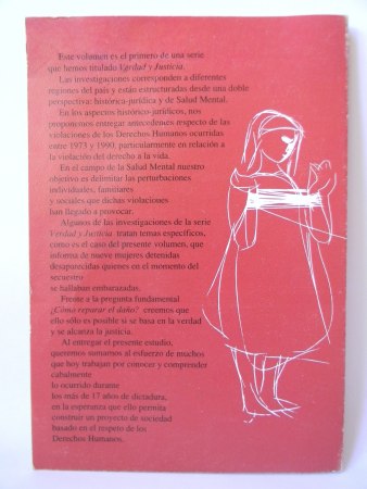 Santiago; CODEPU, Comité de Defensa de los Derechos del Pueblo, Serie Verdad y Justicia Volumen 1, 1990. Primera edición. Portada: «El Hilo», buril, 1960, Roser Bru. Encuadernación rústica. Octavo mayor (21.5×15 cm). 112 páginas, con algunas fotografías. Estado de conservación: Buen estado, cubiertas con leve desgaste.