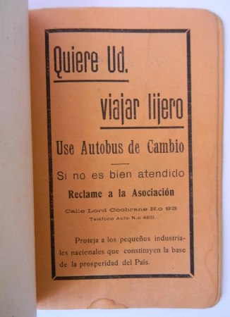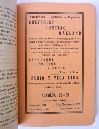 Santiago; Talleres de «El Diario Ilustrado», 1929. Segunda edición, corregida y aumentada. El autor fue Director del Departamento de Tránsito de la Municipalidad de Santiago desde 1922 a 1927. Encuadernación rústica. Octavo (17 x 12 cm). 373 páginas, con algunas reproducciones fotográficas, publicidad de época y circular con los datos para rendir el examen de chofer. Estado de conservación: Buen estado, cubiertas con leve desgaste; firma de anterior propietario en portada.
