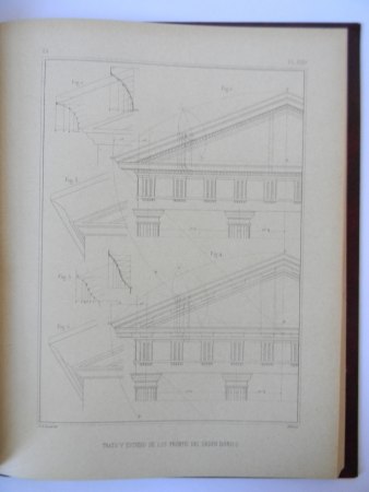 París; Casa Editorial Garnier Hermanos, no indica año [c. 1920]. Obra dividida en 72 láminas que comprenden los cinco órdenes, con indicación de las sombras necesarias para el lavado, la delineación de las fachadas, etc., y con modelos relativos a las órdenes. Compuesto, dibujado y ordenado por J-A Léveil, Arquitecto y Grabado sobre acero por Hibon. Nueva edición. Encuadernación de tapas duras. Cuarto (27.5×22.5 cm). 24 páginas+72 láminas. Estado de conservación: Muy buen estado, ejemplar reencuadernado.